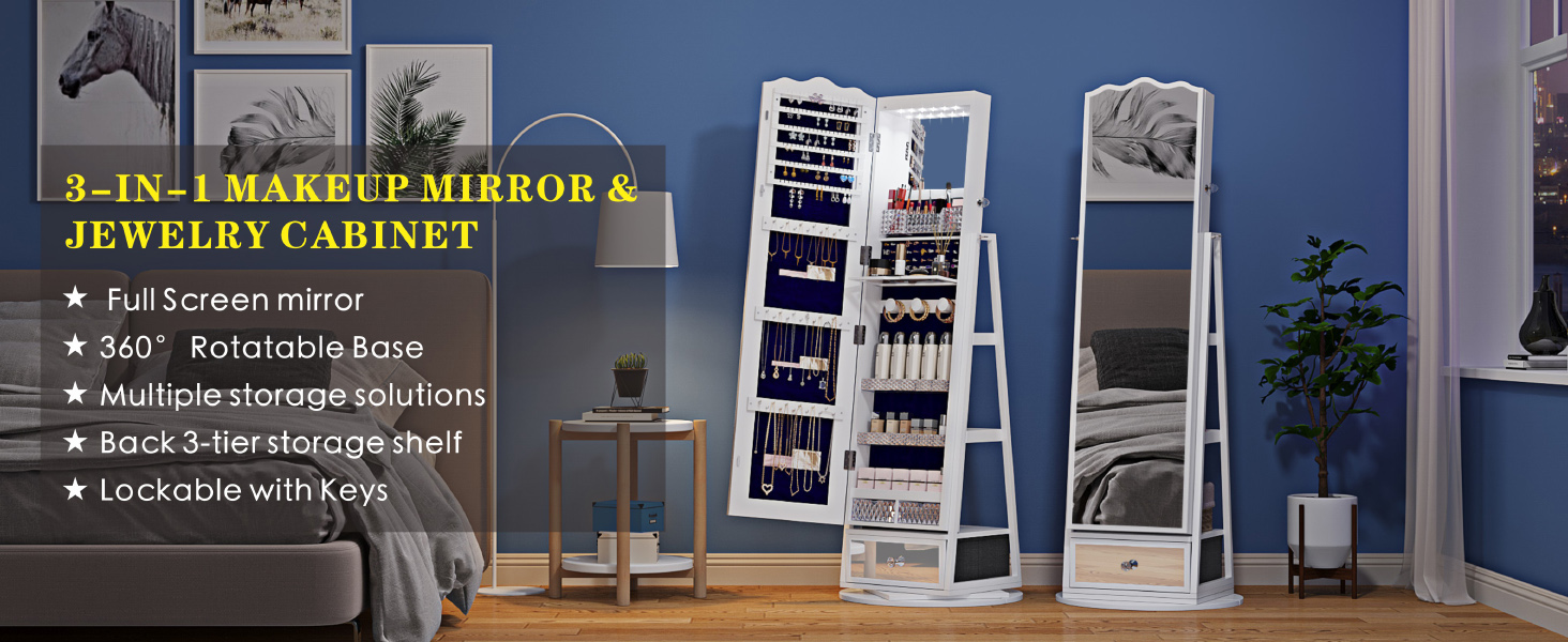 【360° Rotating Base】Jewelry cabinet designed with a sturdy rotating base, this jewelry armoire spins smoothly in any direction, making it easy to access your favorite accessories from all angles.